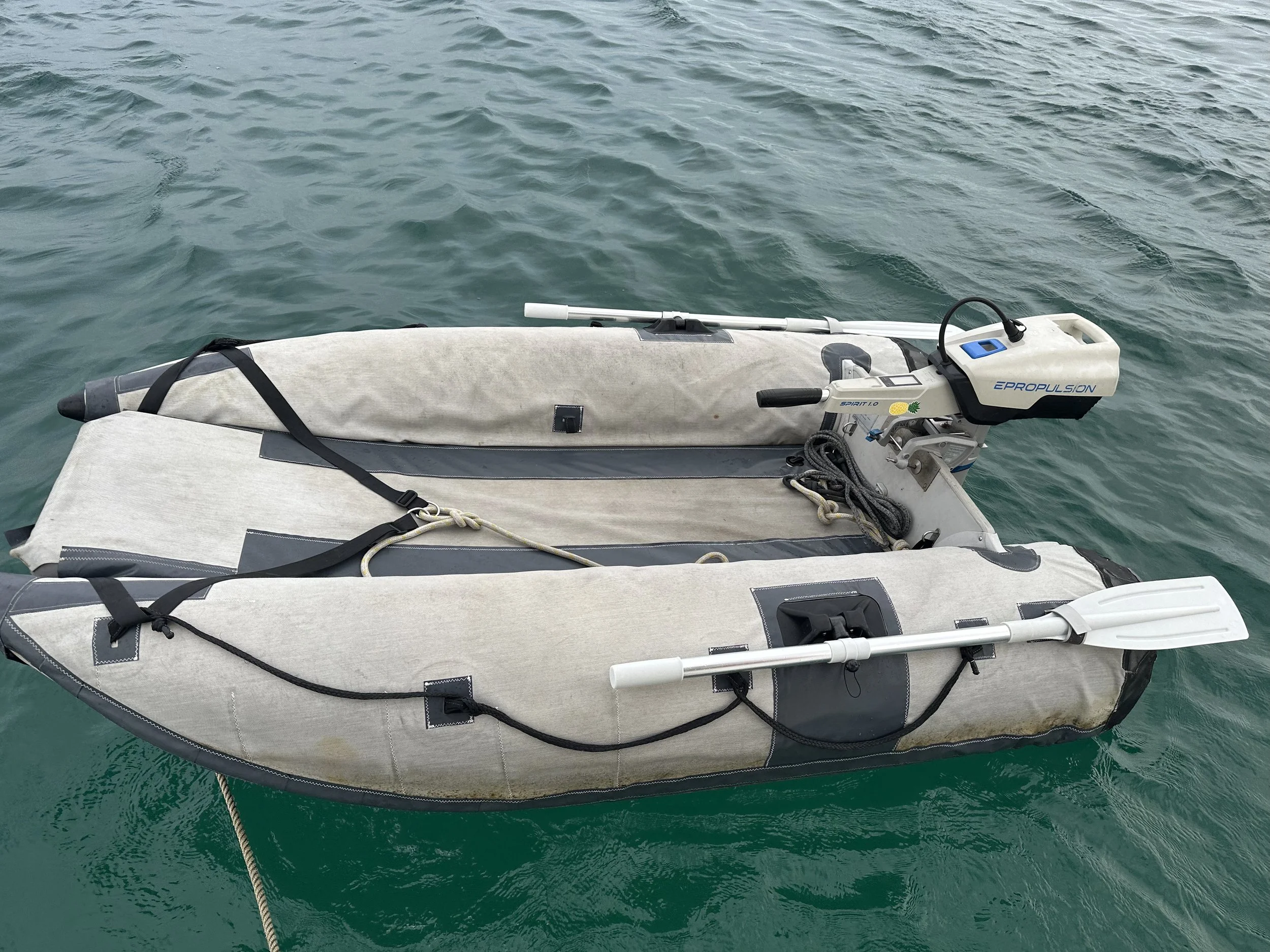 We were used to charter holidays where the outboard motors worked for half a week at best. In the end, we always decided not to opt for the outboard motor if there was an extra charge, as we could row for most of the routes and, as mentioned, the motors usually broke down after half a week anyway. As new boat owners with no technical background, we are happy with things that work and are maintenance-free. We also find the self-sufficiency that we have with an electric outboard motor and no additional petrol cans attractive, as our 10-metre (33 feet) sailing boat is not exactly bursting with storage space. The size of the dinghy is also limited due to the size of the boat, so the equivalent 2.5 hp is not really a deal breaker for us. We bought our sailing boat without a dinghy and associated motor, so we can choose from the full range of products on the market. We opt for a popular electric setup, a Takacat dinghy, as the catamaran shape has less water resistance, and the electric motor.